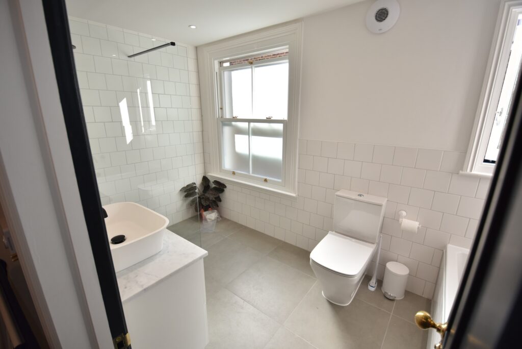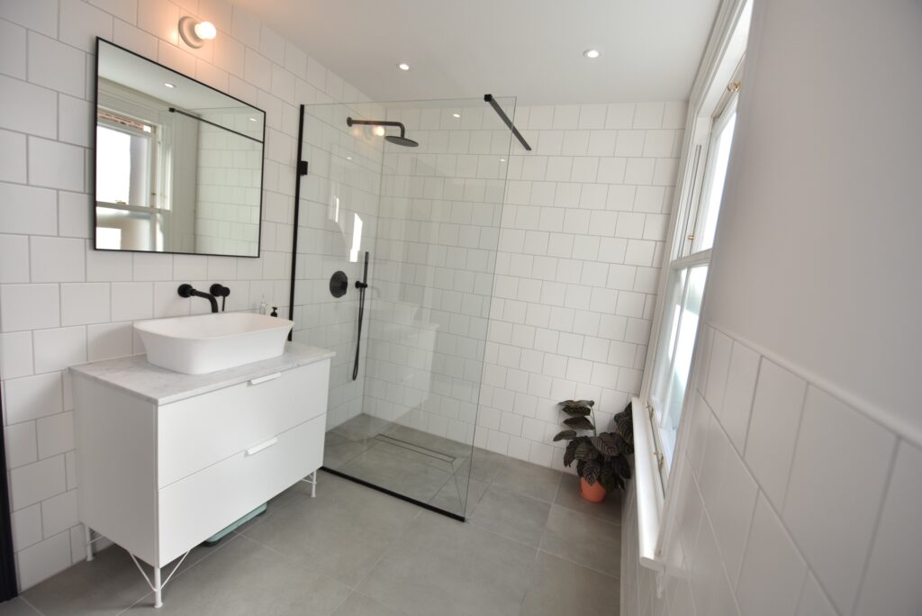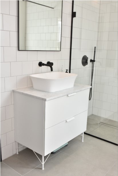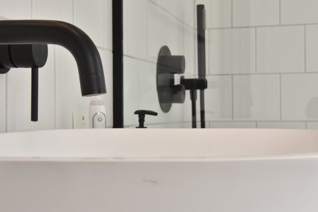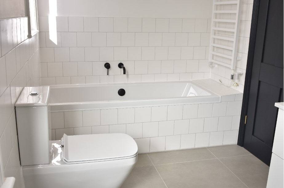 A brilliant white bathroom complimented with black fixtures and fittings.